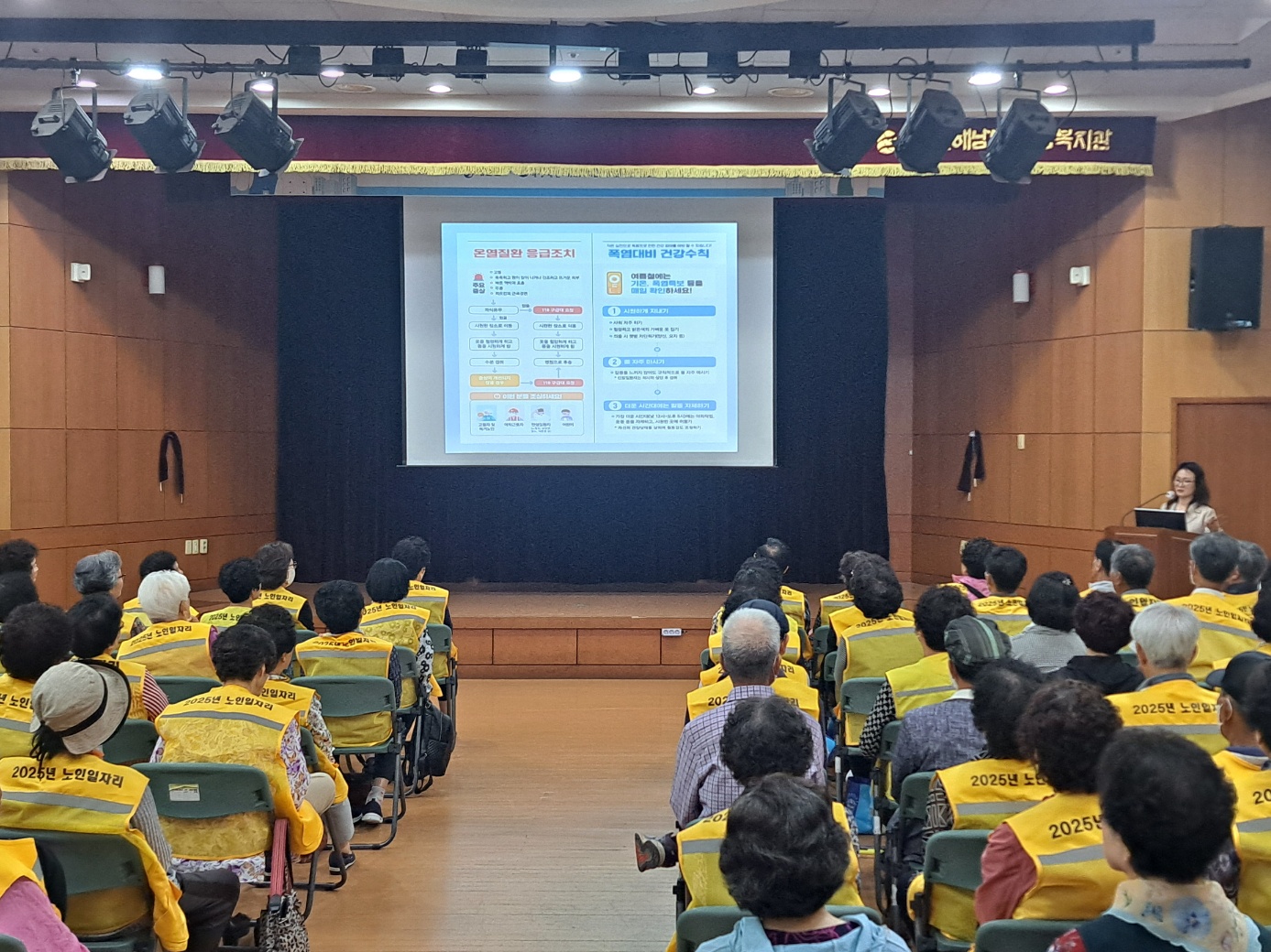 2025년 노인일자리 및 사회활동지원사업 혹서기 안전교육 관리자 0 3197 2025.06.16 10:56 6월 12일, 13일 노인일자리 참여자 혹서기 안전교육을 진행하였습니다.어르신들을 격려해주시기 위해 찾아주신 명현관 군수님의 인사말씀을 시작으로 이번혹서기 교육은 폭염, 온열질환 예방 및 응급상황 대비요령, 태풍 폭우등 안전사고예방에 대해 교육을 하였고 최근 확산되고 있는 코로나19 관련 교육내용을 전달하였습니다.앞으로도 노인일자리 어르신들의 건강과 안전을 최우선으로 생각하여 행복하고 건강한 일자리가 되도록 노력하겠습니다.